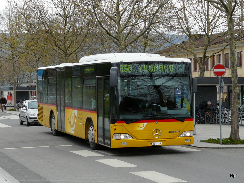 Postauto - Mercedes Citaro VD 1115 unterwegs auf der Linie 650 in Yverdon les Bains am 25.04.2012