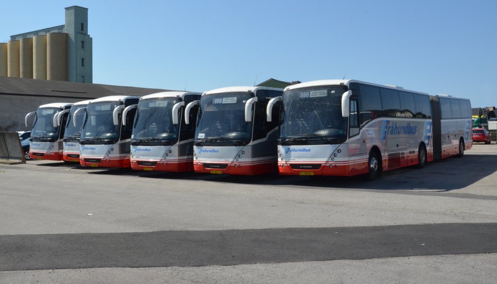 Sechs Volvo Gelenkbusse VDL Jonckheere Mistral aus belgischer Produktion. Stehen am Hafen von Ystad/Schweden. Gesehen am 24.05.2012.