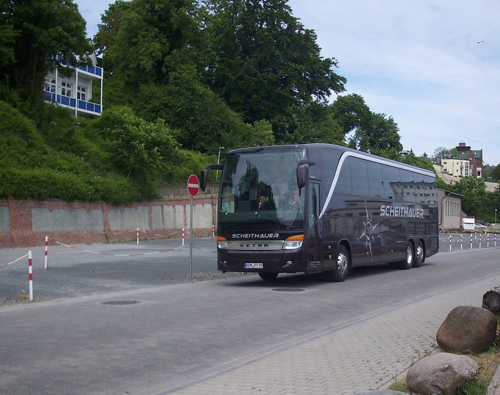 Ein letzter Veruch des Setra 416 HDH von Scheithauer aus Deutschland im Stadthafen Sassnitz am 03.06.2012