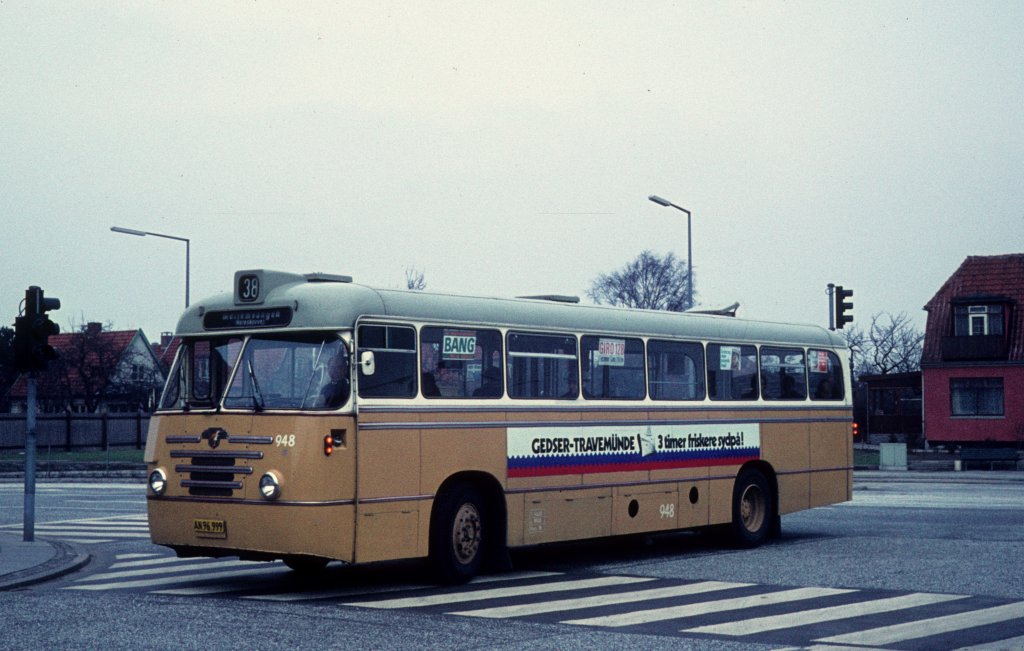 Kopenhagen KS Buslinie 38 (Leyland-DAB 948) Hareskovvej / Mellemvangen am 14. März 1970.