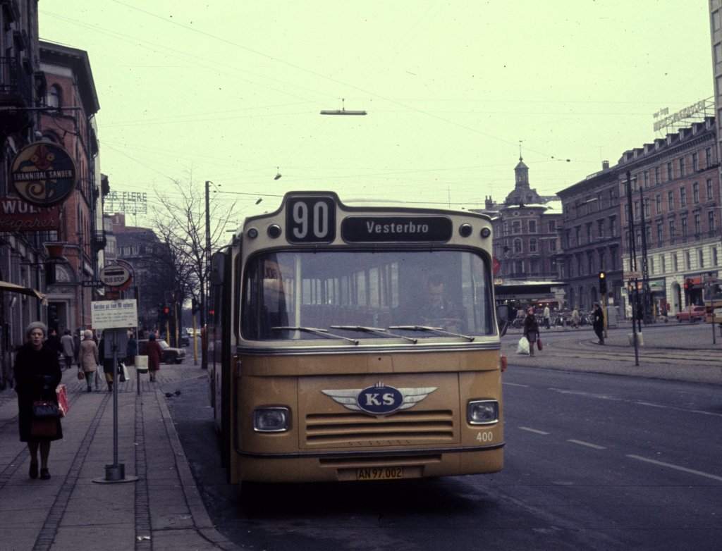 Kopenhagen KS Buslinie 90 (Leyland-DAB 400) Nørre Voldgade / Nørreport station (DSB-Bf Nørreport) am 3. Januar 1970. - Die Buslinie 90 fuhr als "Weihnachtsbuslinie" vom 1. Dezember 1969 bis zum 10. Januar 1970.
