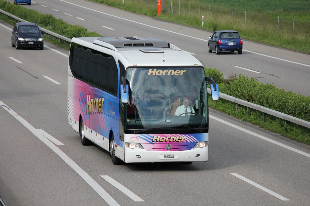 Mercedes Benz Travego de la maison Horner Reisen / Romandie Voyages photographié sur l'autoroute Zurich - Berne le 27.05.2012