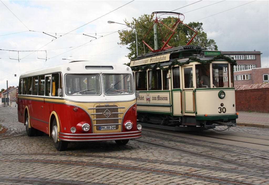 Anläßlich des 100. Geburtstages des Lindner Tw 30 der VBB gesellte sich der H6 B Bus Baujahr 1957 neben diese in Brandenburg am 08.09.2012 vor dem ehemaligen Betriebshof in der Bauhofstr.