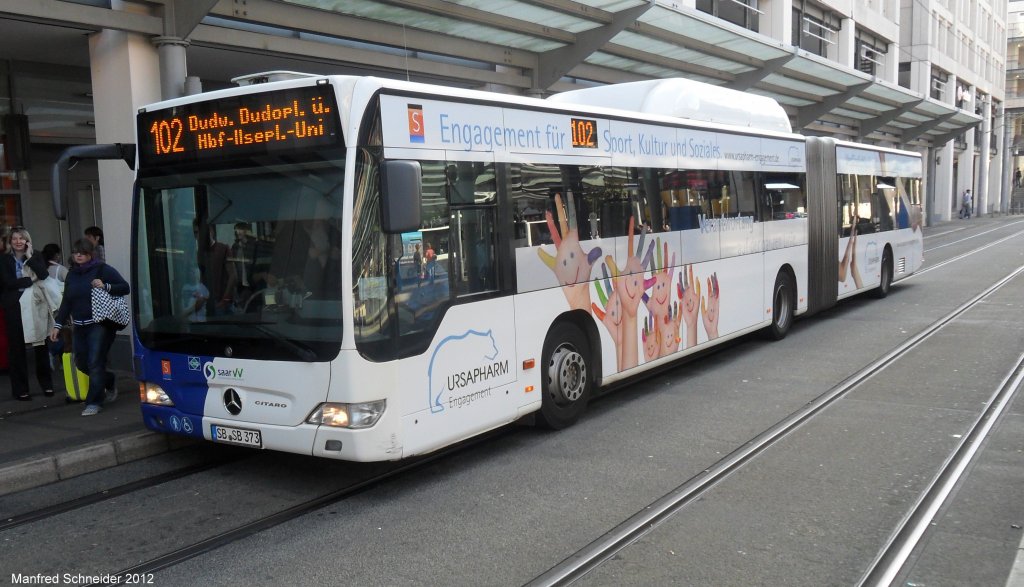 Mercedes Citaro Gelenkbus von Saarbahn und Bus mit neuer Werbung. Das Bild habe ich am 12.09.2012 in Saarbrücken gemacht.