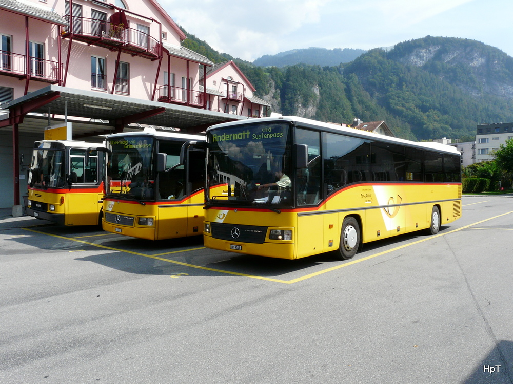 Postauto - Mercedes Integro BE 417870 und UR 9105 und NAW BE 401568 bei der Postautostation in Meiringen am 11.09.2012