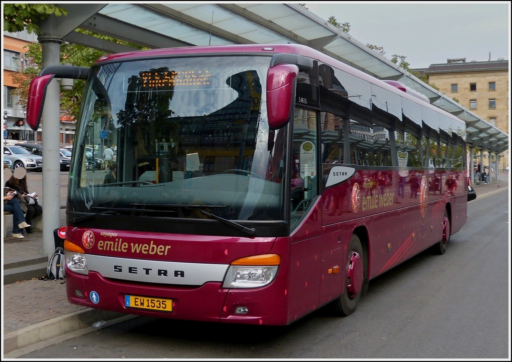 (EW 1535) Am Bahnhof von Saarbrücken wartet dieser Setra S 416 UL der Busfirma Emil Weber auf Fahrgäste um diese ohne zwischen Halt zum Bahnhof von Luxemburg zu fahren. Während der Woche wird dieser Service 7 mal, Samstags 5 mal und Sontags 4 mal angeboten. Die Fahrtdauer beträgt ungefähr 1,5 Stunden. 18.09.2012