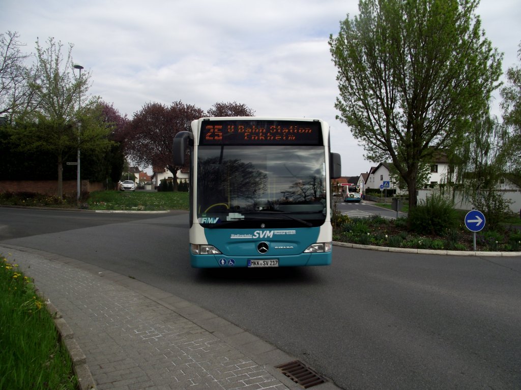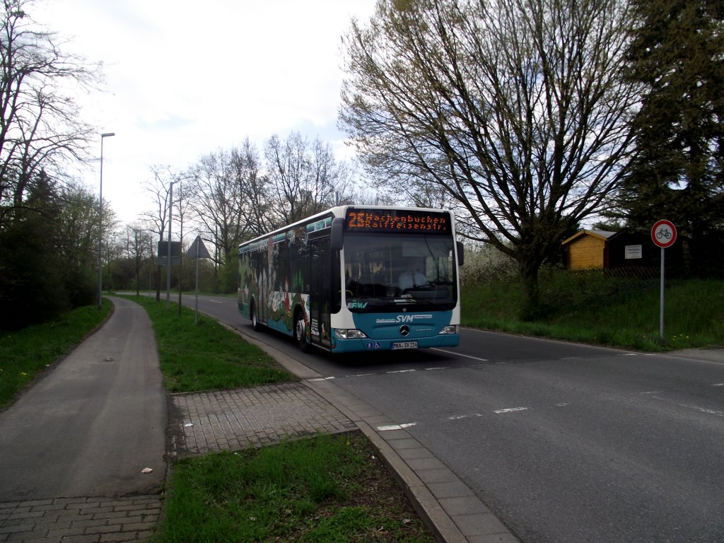 Mercedes Benz Citaro C1 Facelift des SVM am 23.04.13 in Maintal Hochstadt auf der Linie 25 nach Frankfurt am Main Enkheim U-Bahn Station. Im Hintergrund sieht man den Gegenbus mit Märchenexpress Werbung.