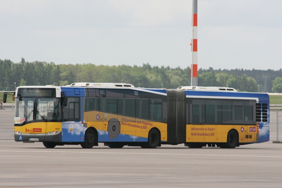 Gelenkbus Solaris Urbino der BVG bei den Besuchertagen auf dem Vorfeld des neuen Flughafens Berlin-Brandenburg BER "Willy Brandt" am 12.5.2012