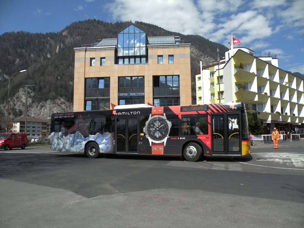 Solaris Bus der Post mit der Vollwerbung für HAMILTON Uhren kurz vor dem Bahnhof Interlaken Ost. Die Aufnahme stammt vom 18.04.2013.