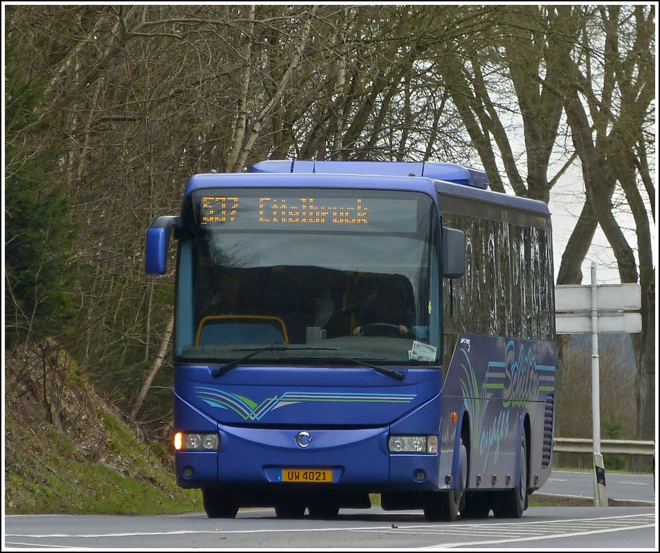 (UW 4021) Irisbus Crossway des Busunternehmens Schiltz auf der Linie Bastogne - Ettelbrück unterwegs, aufgenommen am 16.04.2013 in der Nähe von Wiltz.
