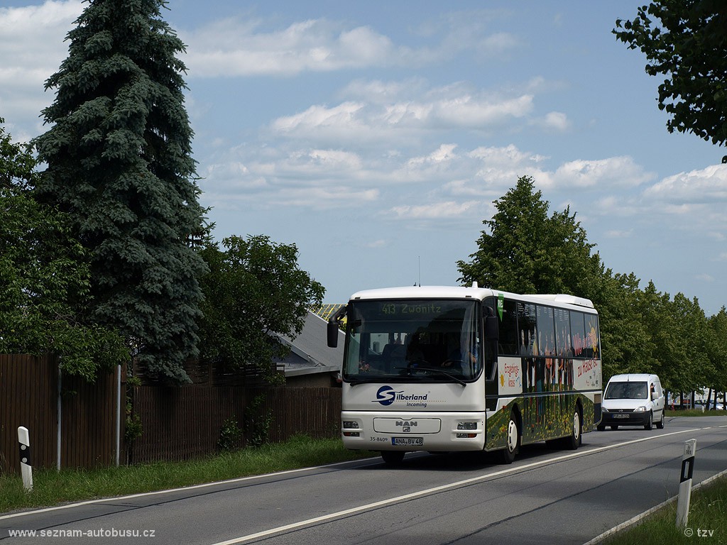 Der Wagen #35-8413 fährt auf der Linie 413 aus Annaberg nach Zwönitz in Annaberg, Dresdnerstrasse.
