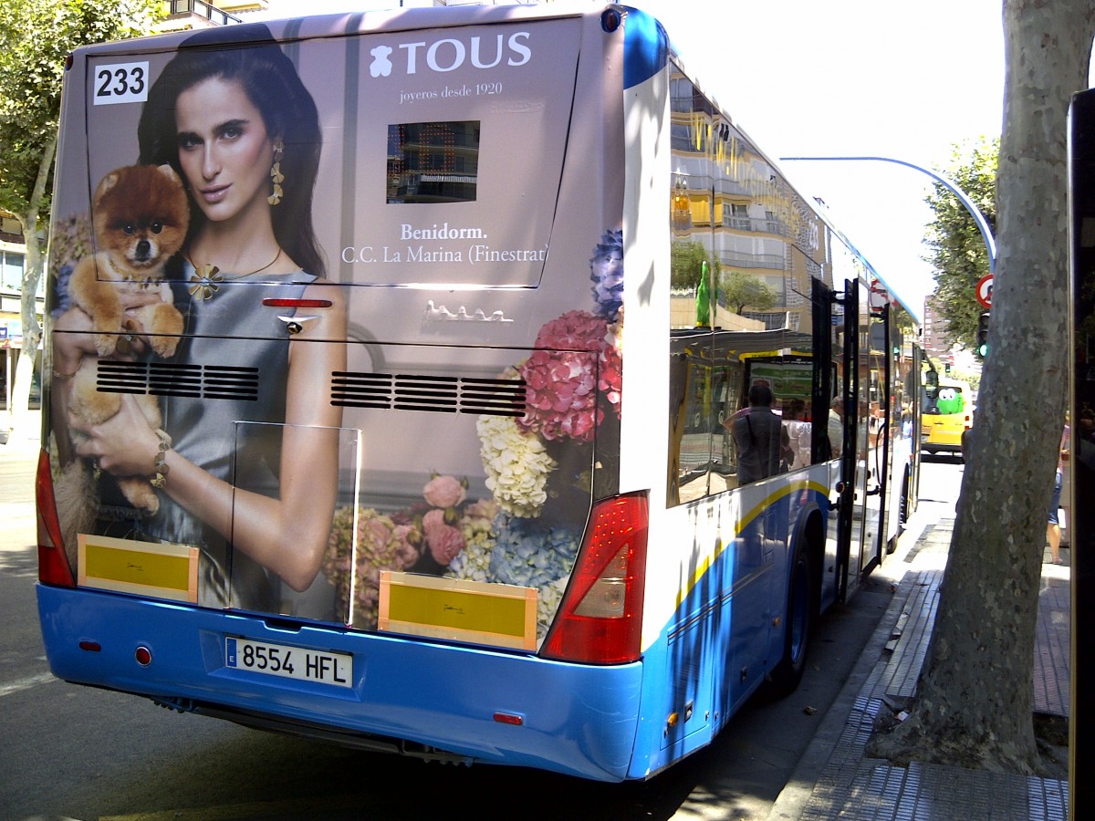 Heckansicht vom Wagen 233, Tata Hispano Intea LE, mit Heckwerbung für den Juwelier Tous, in Benidorm (Spanien), Avenida de Madrid am 14.08.2013.