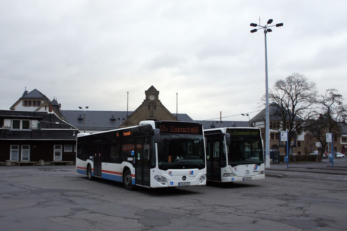Stadtbus Eisenach: Mercedes-Benz Citaro Facelift und Mercedes-Benz Citaro C2 Gelenkbus der KVG Eisenach, eingesetzt im Stadtverkehr. Aufgenommen am Stadtbusbahnhof von Eisenach im Dezember 2014.