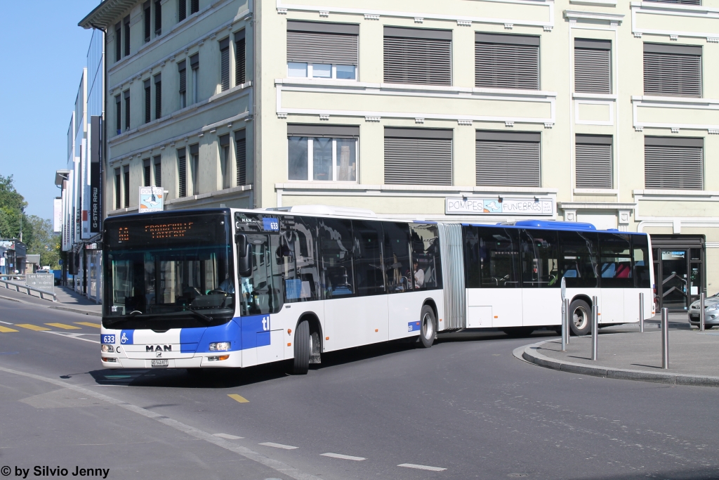 Nr. 633 (MAN A23 Lion's City GL) am 15.6.2014 in Lausanne-Flon. Ein Grossteil der Lausanner Diesel-/Gasbusflutte wurde im Jahre 2014 durch MAN-Dieselbusse ersetzt.