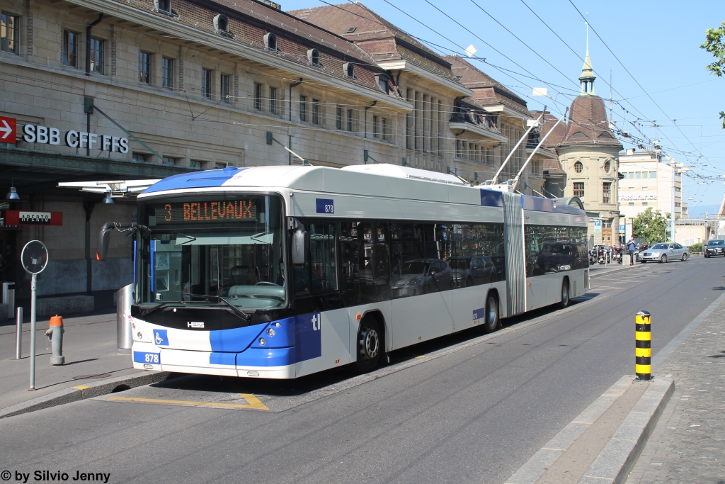 tl Nr. 878 (Hess Swisstrolley 4 BGT-N2C) am 15.6.2014 beim Bahnhof Lausanne.
