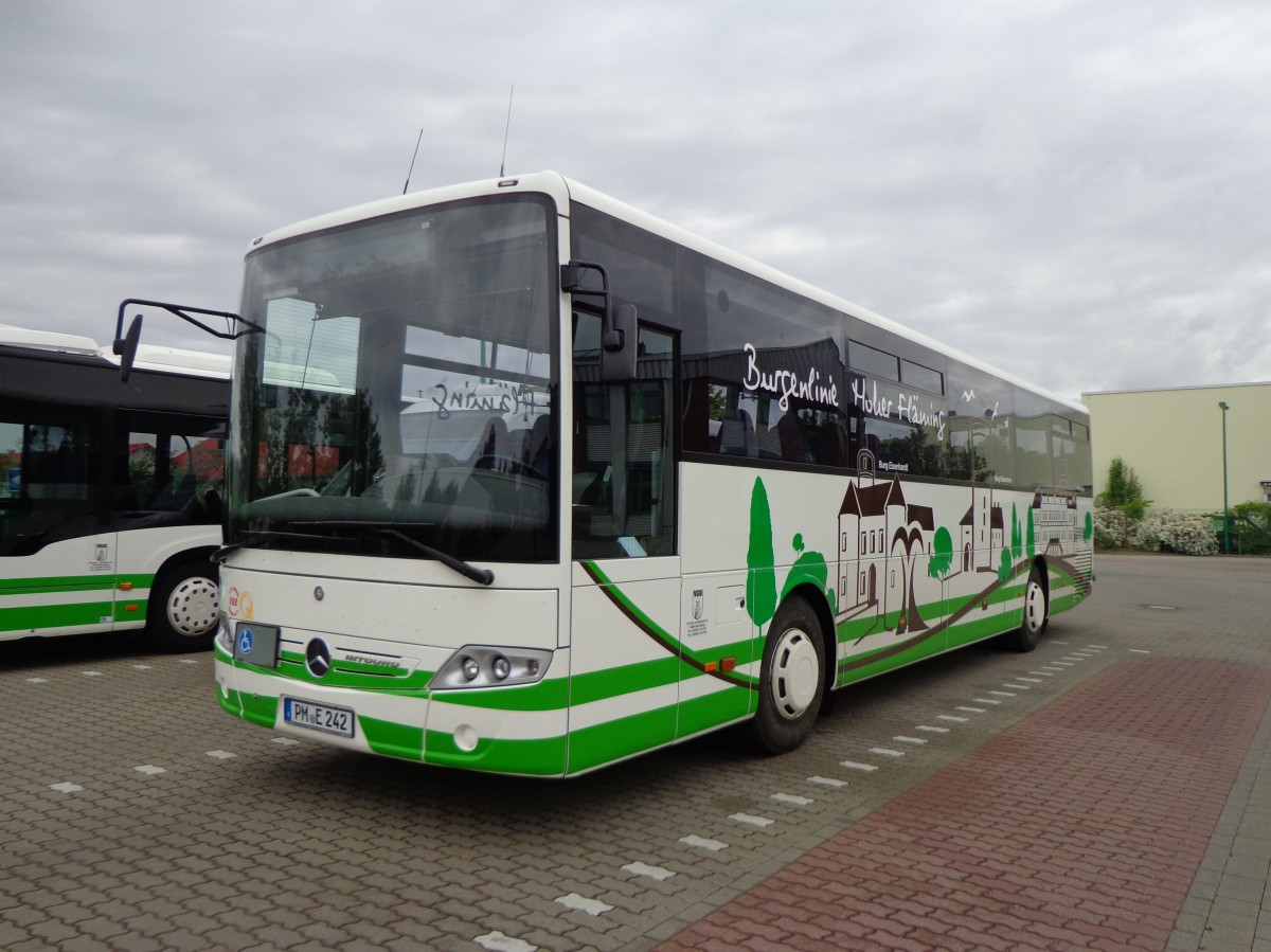 Der PM-E 242, ein MB O 560 Intouro, der auch auf der neuen Burgenlinie 572 (Werbung auf dem Bus) eingesetzt wird, hier in Bad Belzig, Seedoche am 07.05.14