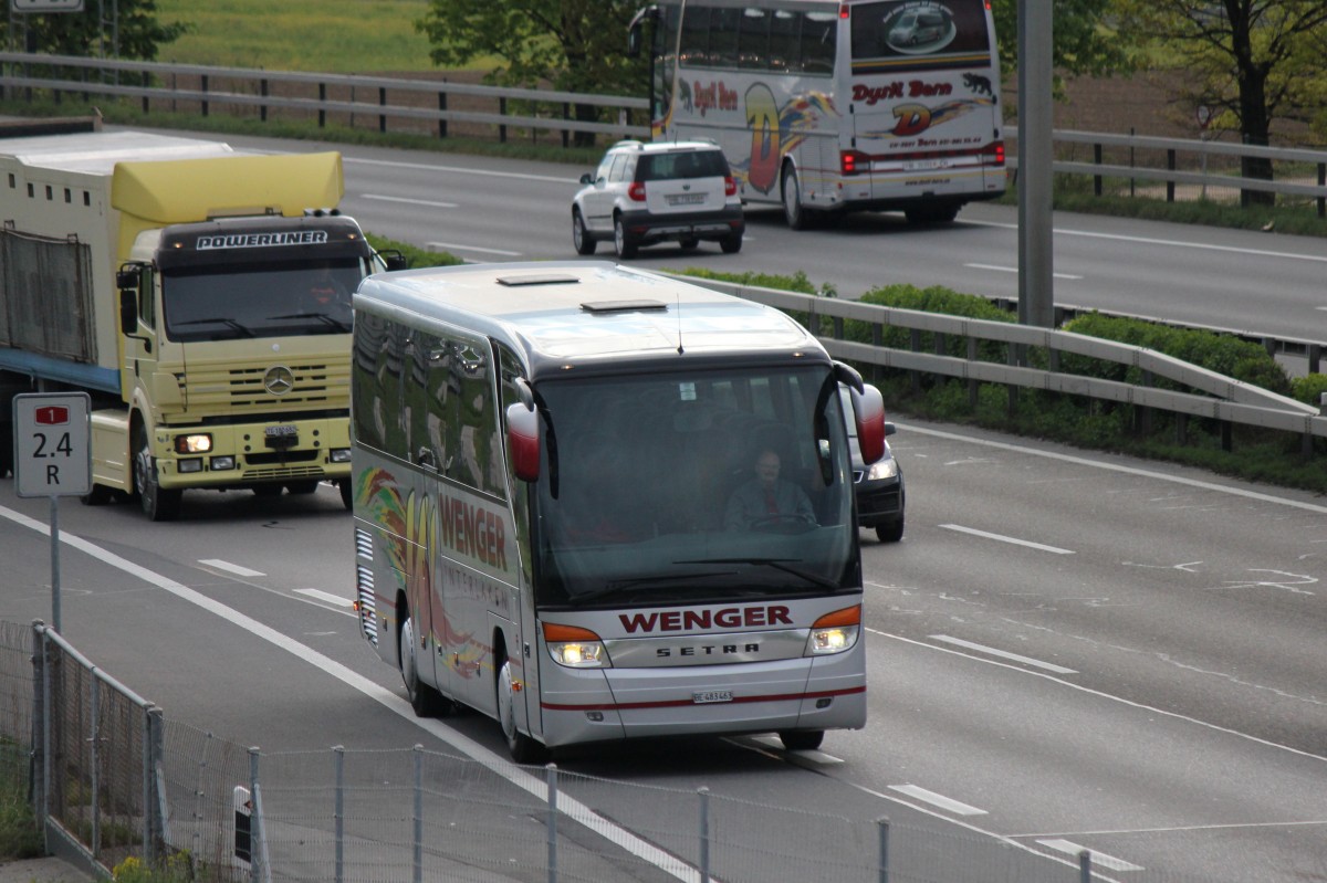 Setra 415 HD Wenger Interlaken (avec en arrière plan Setra 315 HD de la maison associée Dysli Berne) près de Berne avril 2014