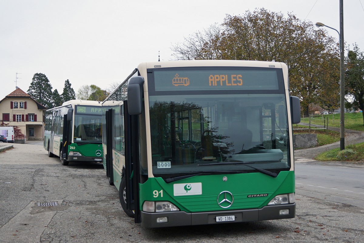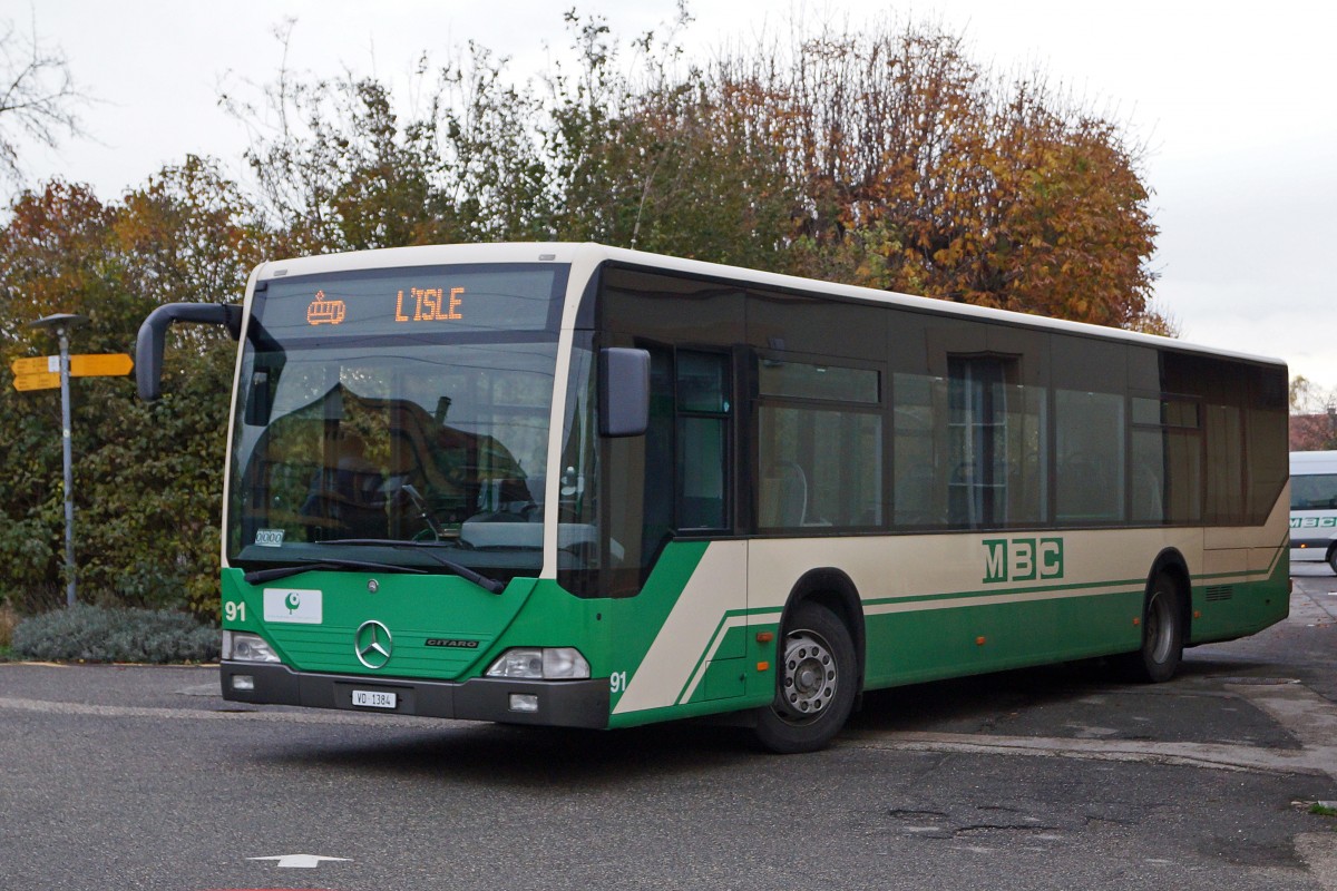 MCB/BAM: Infolge Zuckerrübenverlad auf offener Strecke wurden am 4. November 2014 gleich mehrere Züge auf der Strecke APPLES - L'ISLE durch Busse ersetzt. MERCEDES CITRARO Nr. 91 im Linienverkehr und 292 im Schülerverkehr in L'ISLE kurz vor der Abfahrt nach APPLES.