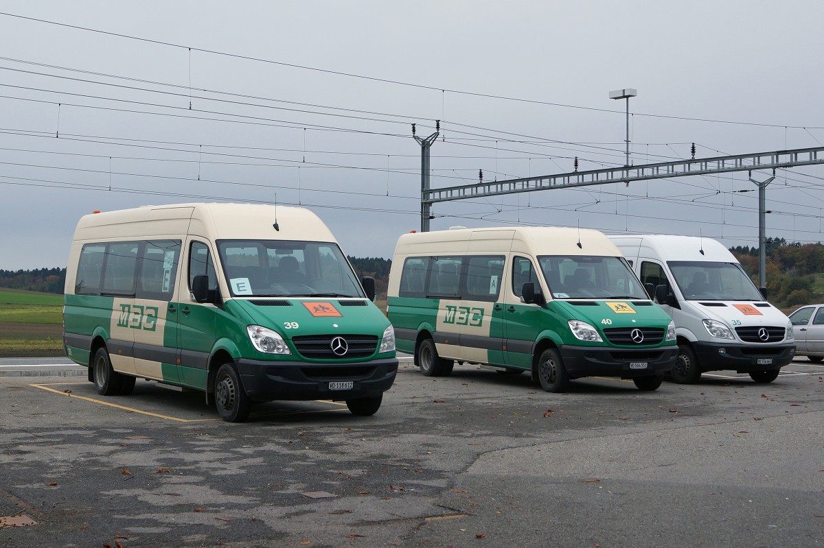 MBC/SAPJV Schülerverkehr: In der näheren Umgebung von Morges werden die Schüler mit Mercedes-Kleinbussen von MCB/BAM transportiert. In der weiteren Umgebung von Morges werden die Schüler mit den grauen Mercedes-Schülerbussen von SAPJV befördert. Am 4. November 2014 warten die Kleinbusse mit den Nummern 39, 40 und 35 in Apples auf ihren Mittagseinsatz.