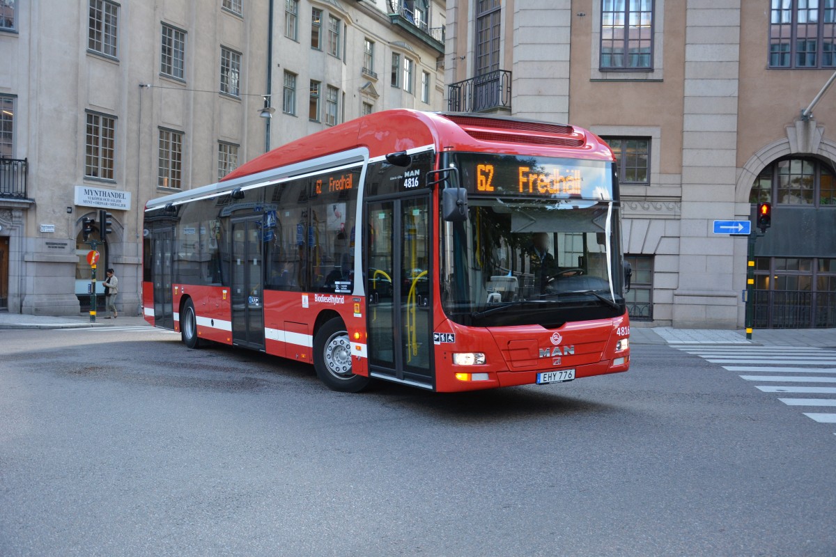 EHY 776 fährt am 16.09.2014 auf der Linie 62. Aufgenommen wurde ein MAN Lion's City Hybrid in der Innenstadt von Stockholm.