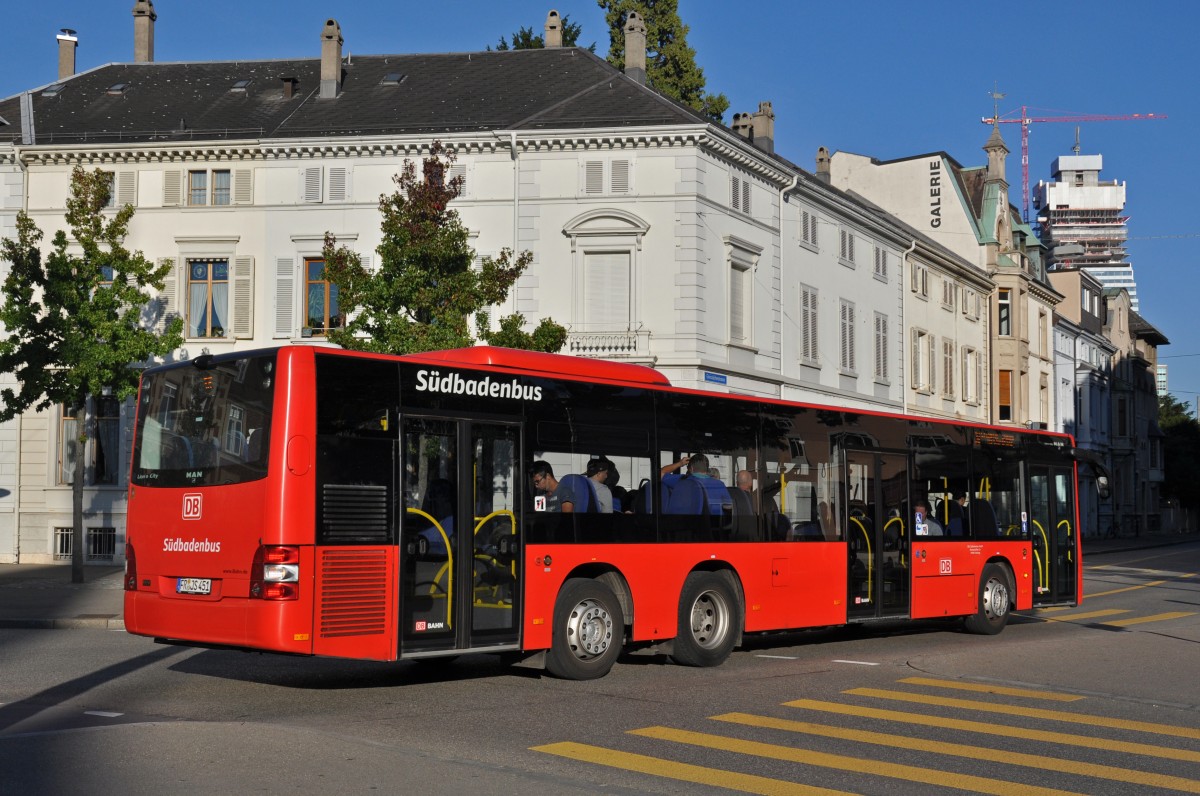 MAN Lions City von Südbadenbus auf der Linie 38 kurz nach der Haltestelle Wettsteinplatz. Die Aufnahme stammt vom 27.09.2014.