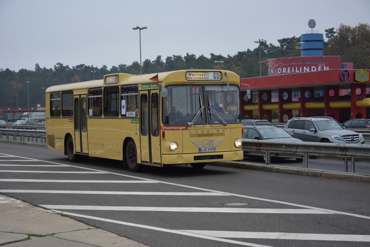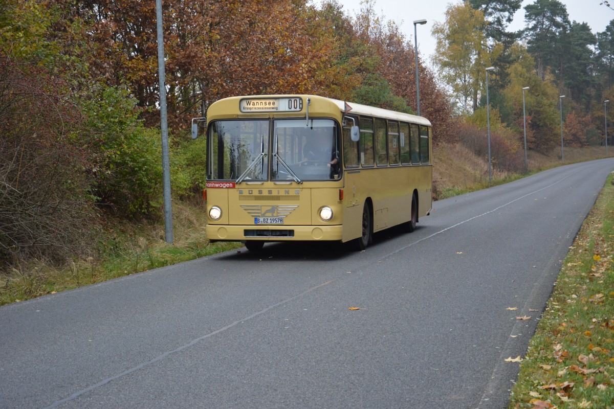 B-BZ 1957H (Büssing E2H) auf Sonderfahrt am 09.11.2014 auf dem Weg nach Drewitz-Dreilinden-Kleinmachnow. Aufgenommen Düppeler Forst.