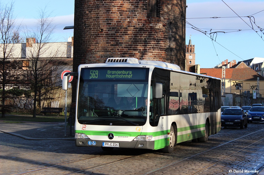 Brandenburg, ein Mercedes-Benz Citaro Ü (Facelift, Baujahr 2009, ex BRB-VK 14) der VGBelzig erreicht den Nicolaiplatz in Brandenburg an der Havel am 21.12.2013 .