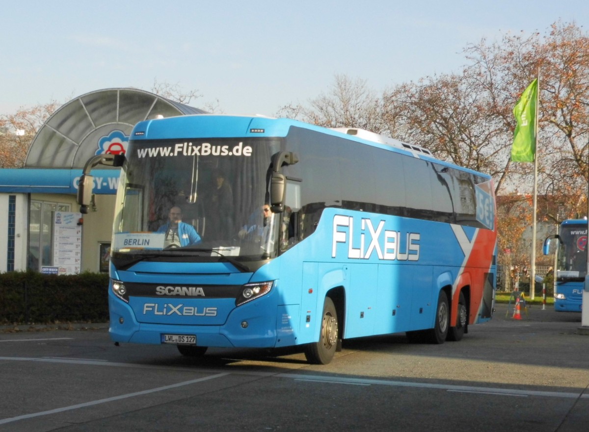 Ein Scania Touring L von Flixbus (Fa.TRS Grabow) am Berliner ZOB, 23.11.14