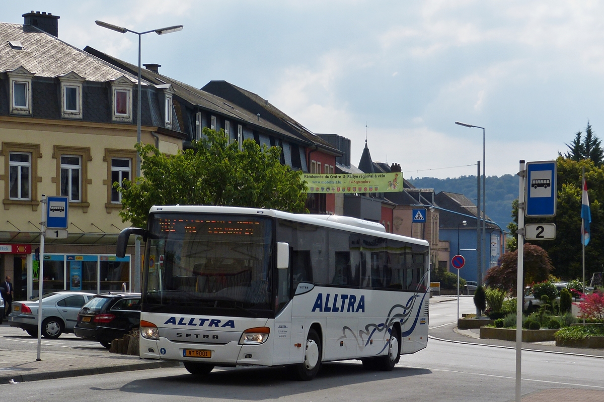 . AT 9001, Setra S 415 UL, von Alltra Reisen, aufgenommen bei seiner Ankunft beim Bahnhof von Mersch, nach einem kurzen Halt fährt er zurück nach Ettelbrück. Gruß an den freundlichen Fahrer. 02.09.2014