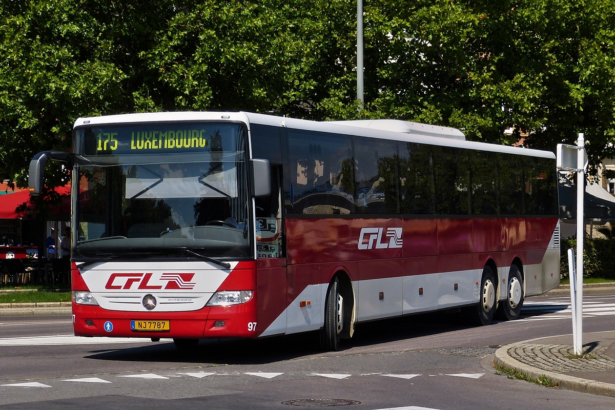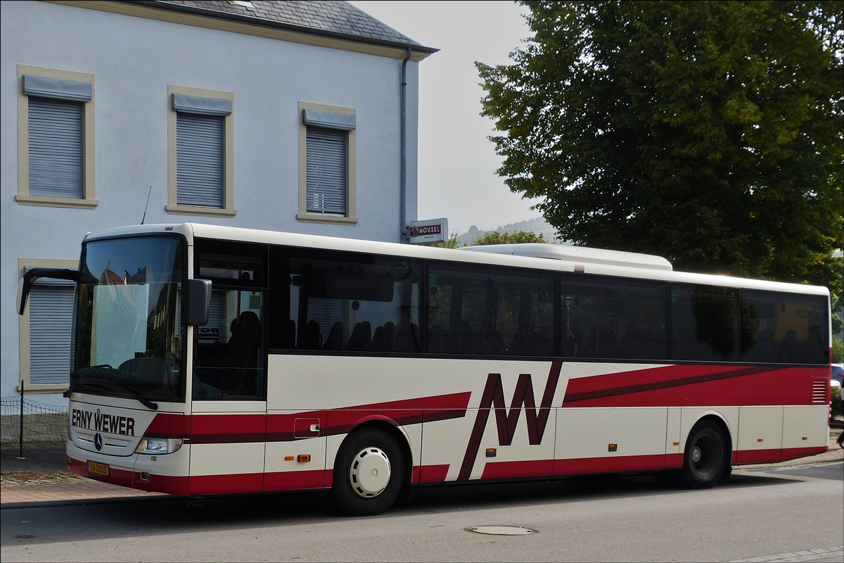 . EW 2805 Mercedes Benz Integro von Erny Wewer, steht an einer Bushaltestelle in Grevenmacher. 02.09.2014