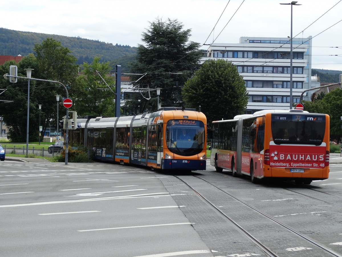 RNV Mercedes Benz Citaro C1 Facelift von hinten drift einen RNV Variobahn am 30.08.14 in Heidelberg