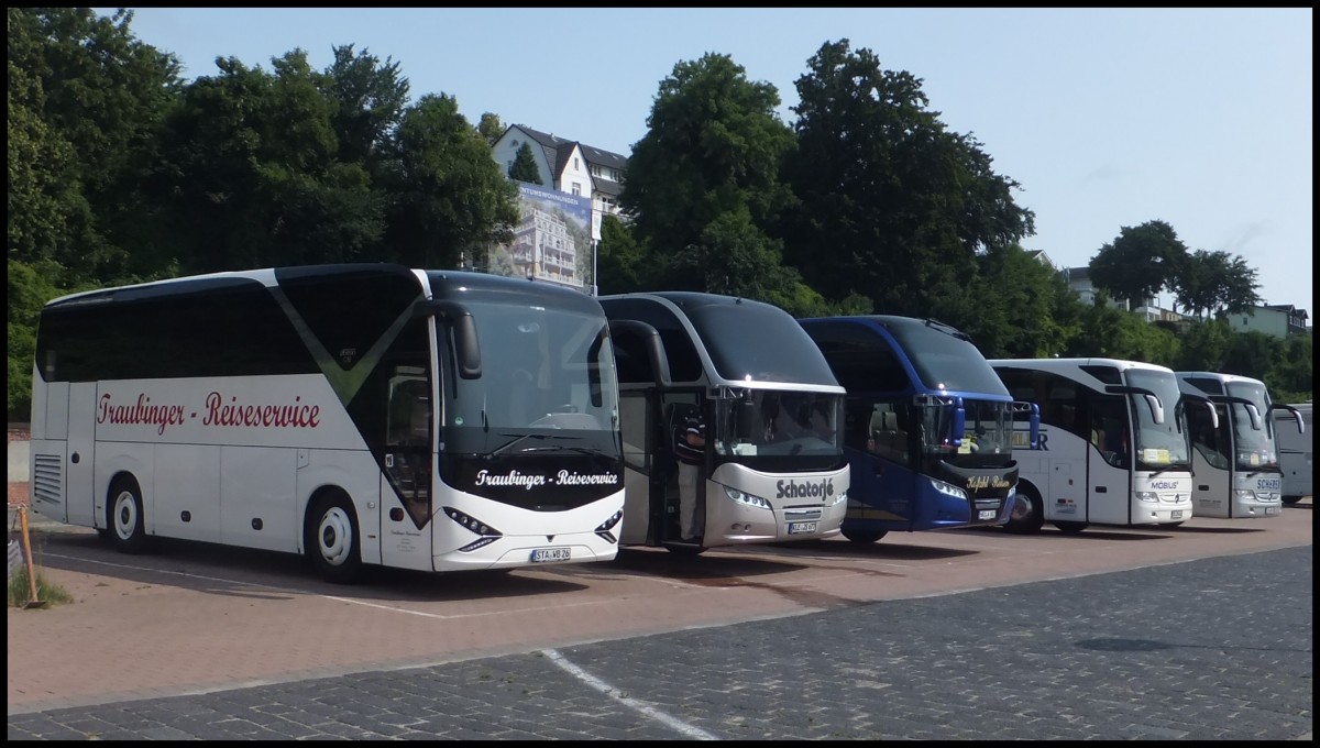 Viseon C10, zwei Neoplan Cityliner und zwei Mercedes Tourismo aus Deutschland im Stadthafen Sassnitz am 09.07.2013