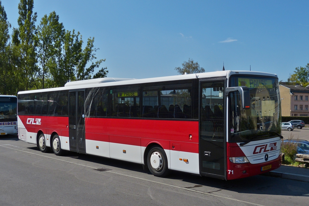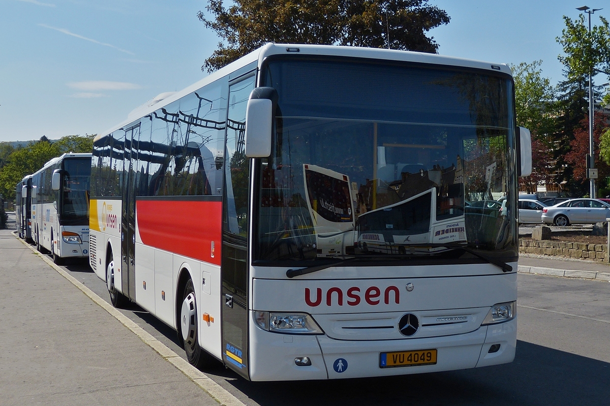. VU 4049 Mercedes Benz Integro von Voyages Unsen in neuem Farbkleid dieser Busfirma am Bahnhof in Ettelbrück. 12.09.2014