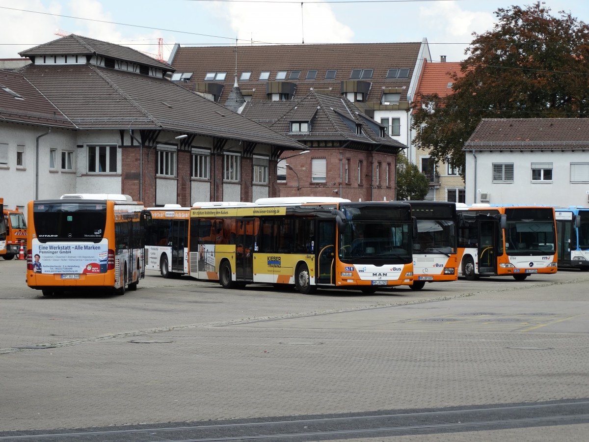 vBus MAN Lions City und Mercedes Benz O405 am 27.09.14 in Heidelberg im Betriebshof durch den Zaun fotografiert