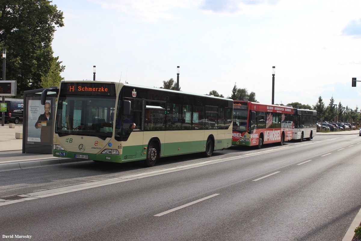 Wagen 532 trifft am Hauptbahnhof auf 535 der VBBr. Dahinter steht ein kleiner Neoplan der Firma Behrendt, Lehnin. (22.08.2014)