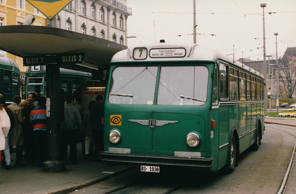 BVB: FBW Wagen Nr. 38 mit Kennzeichen BS 1938 auf der Tram Ersatzlinie 7 Bahnhof SBB - Binningen im November 1985.