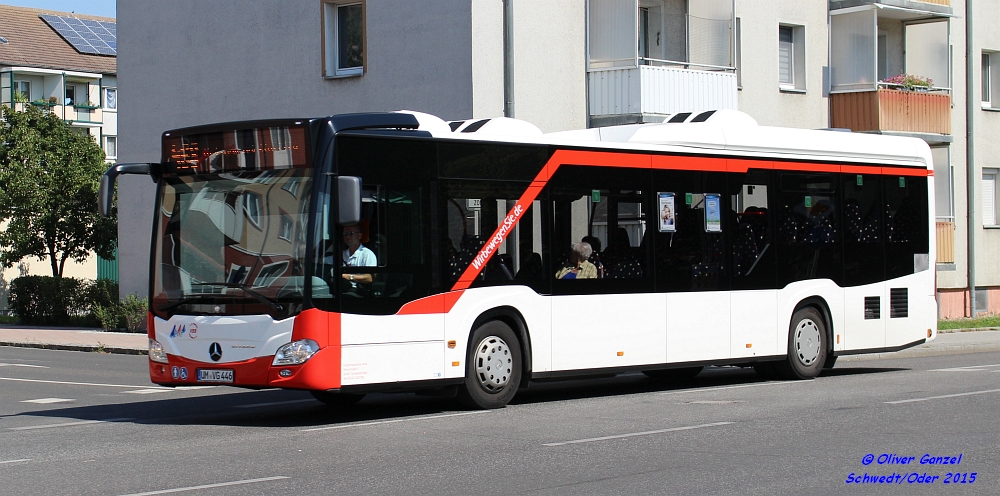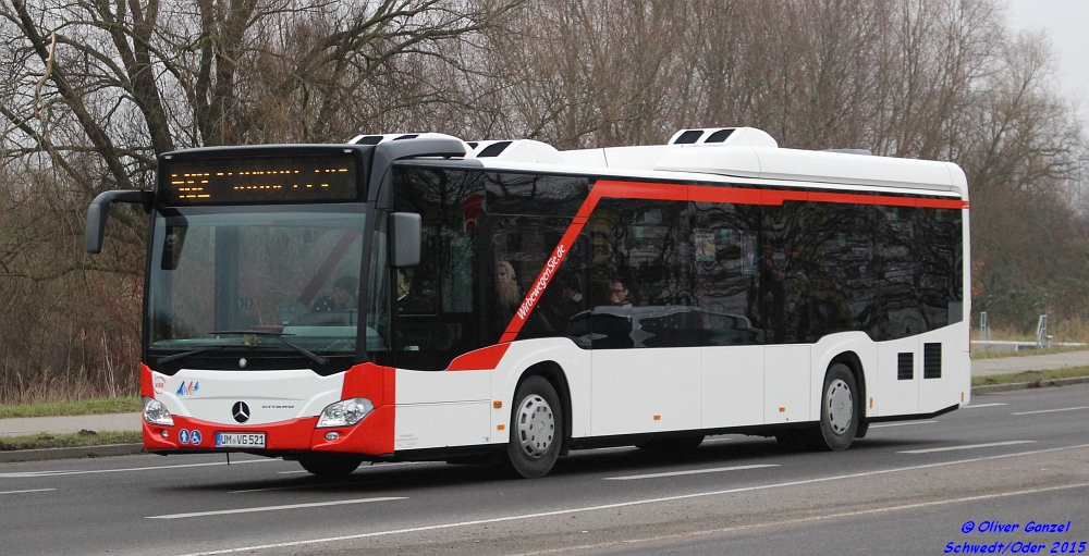 Mercedes-Benz O530 C2 Citaro K, Wagennummer 523, der Uckermärkischen Verkehrsgesellschaft mbH, 2015 auf der Linie 486 in Schwedt/Oder.