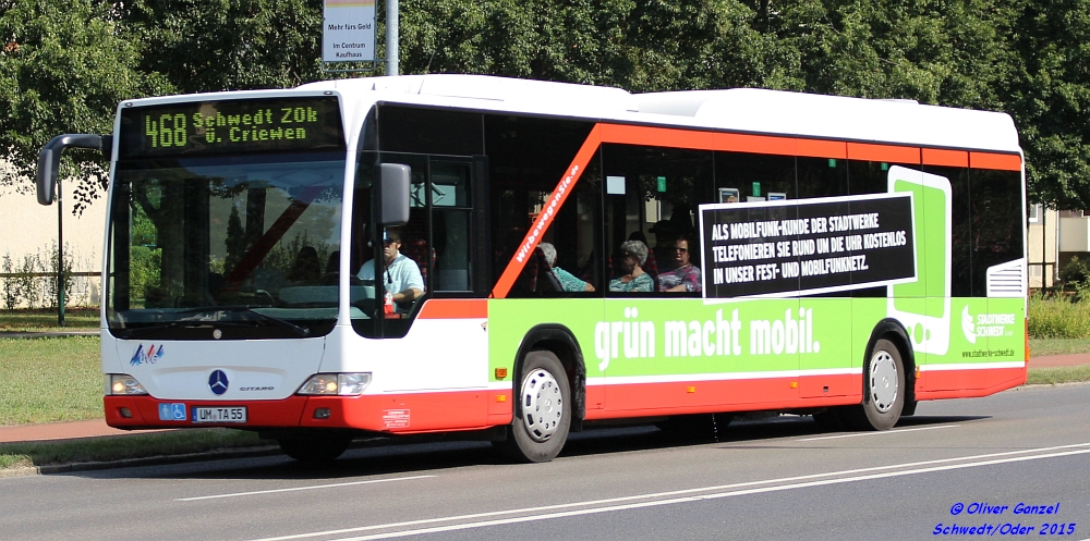Mercedes-Benz O530 Citaro, Wagennummer 717, der Uckermärkischen Verkehrsgesellschaft mbH, 2015 auf der Linie 481 in Schwedt/Oder.