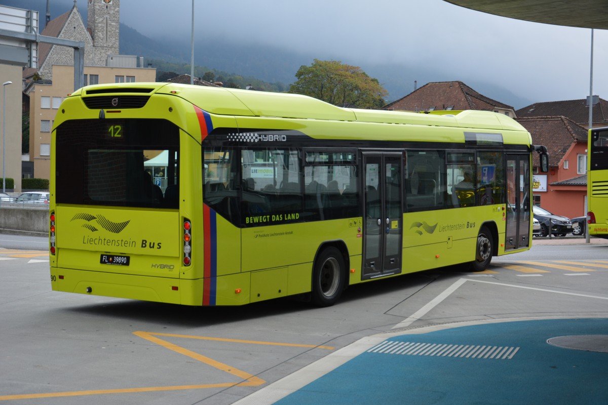 Am 09.10.2015 fährt FL-39890 (Volvo Hybrid 7700) auf der Linie 12. Aufgenommen in Schaan, Leichtenstein.