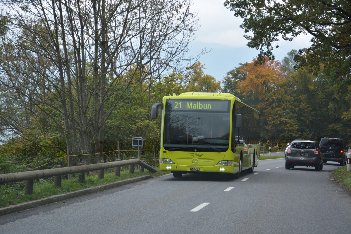 FL-39818 fährt am 09.10.2015 auf der Linie 21 nach Malbun. Aufgnenommen wurde ein Mercedes Benz Citaro Facelift / zwischen Triesen und Triesenberg.