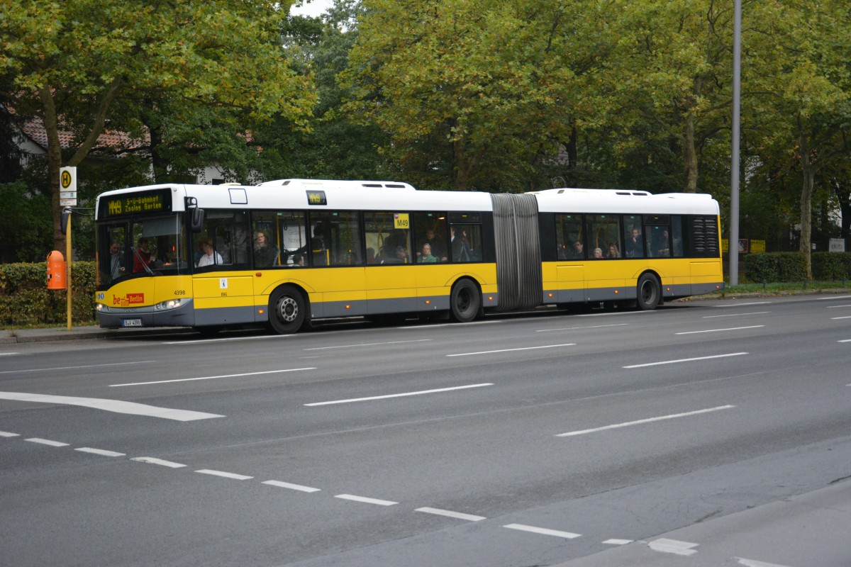 B-V 4398 fährt am 26.09.2014 auf der Linie M49 nach Berlin Zoologischer Garten. Aufgenommen wurde Solaris Urbino 18, Flatowalle.