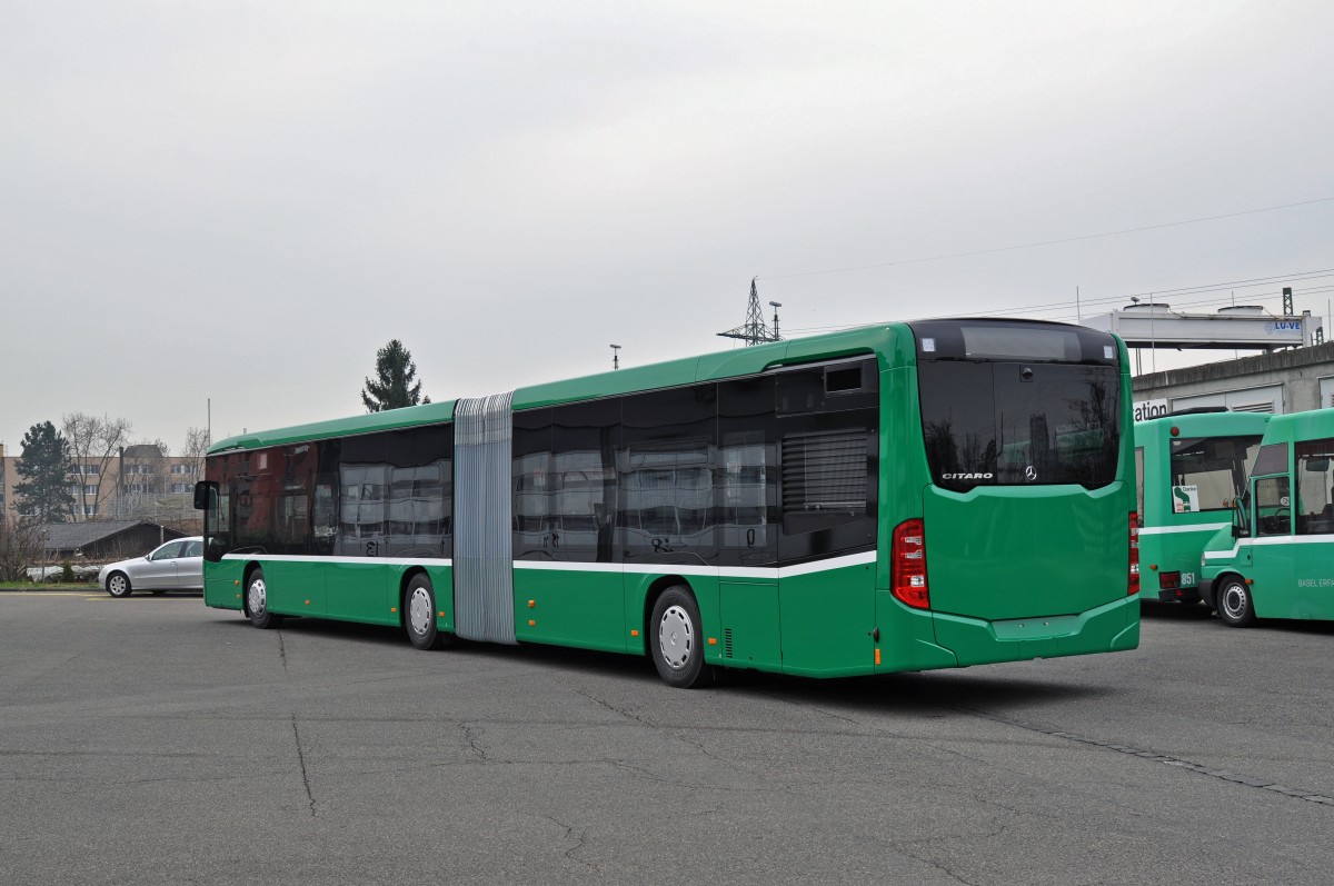 Fabrikneuer Mercedes Citaro 530 Euro VI, der die Betriebsnummer 7003 erhalten wird, steht auf dem Hof der Garage Rankstrasse. Die Aufnahme stammt vom 16.03.2015.