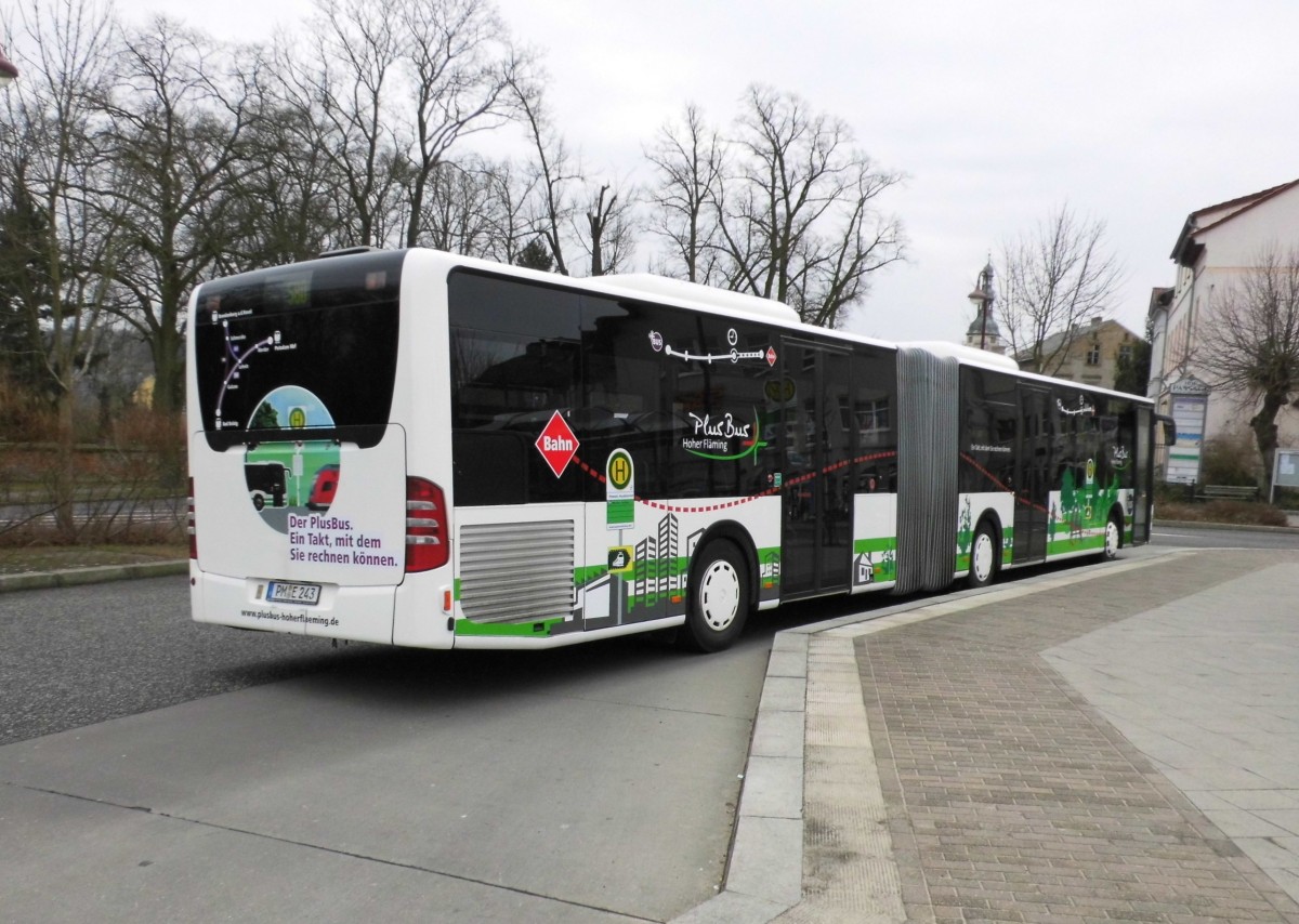 PM-E 243 ist ein MB Citaro GÜ Bj.2006, seit kurzem auch mit PlusBus Werbung unterwegs, hier am Bad Belziger Busbahnhof auf Linie 580 nach Potsdam am 6.3.15