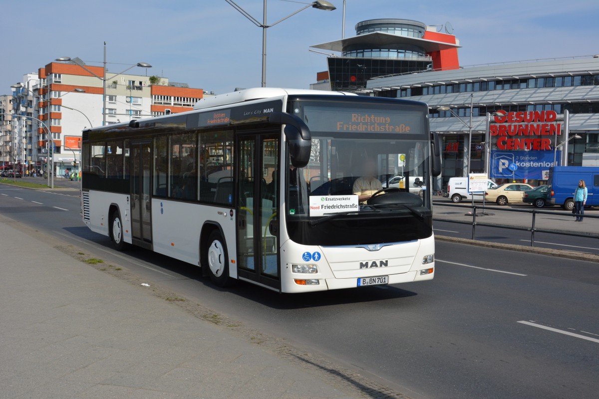 B-BN 701 (MAN Lion's City Low Entry) fährt am 11.04.2015 für die S-Bahn Berlin Schienenersatzverkehr. Aufgenommen am Bahnhof Gesundbrunnen.