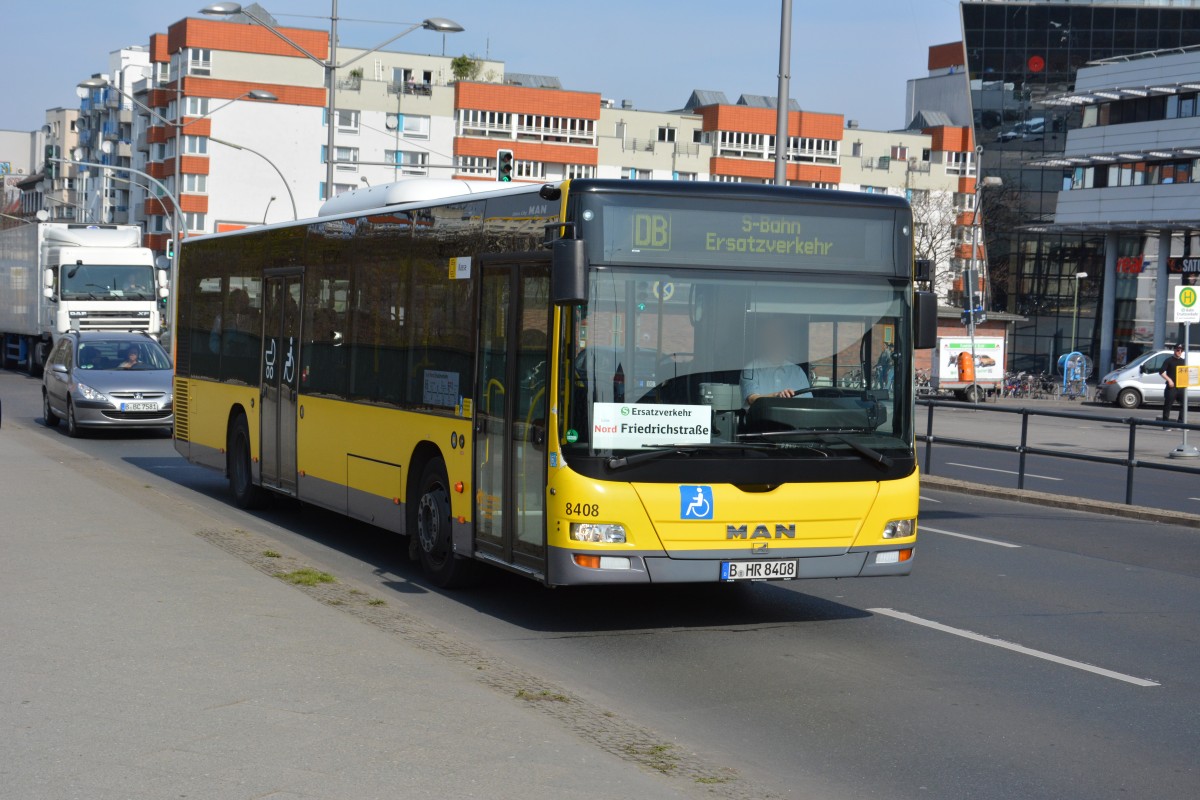 B-HR 8408 (Lion's City) fährt für die S-Bahn Berlin Schienenersatzverkehr. Aufgenommen am 11.04.2015 / Berlin Gesundbrunnen.