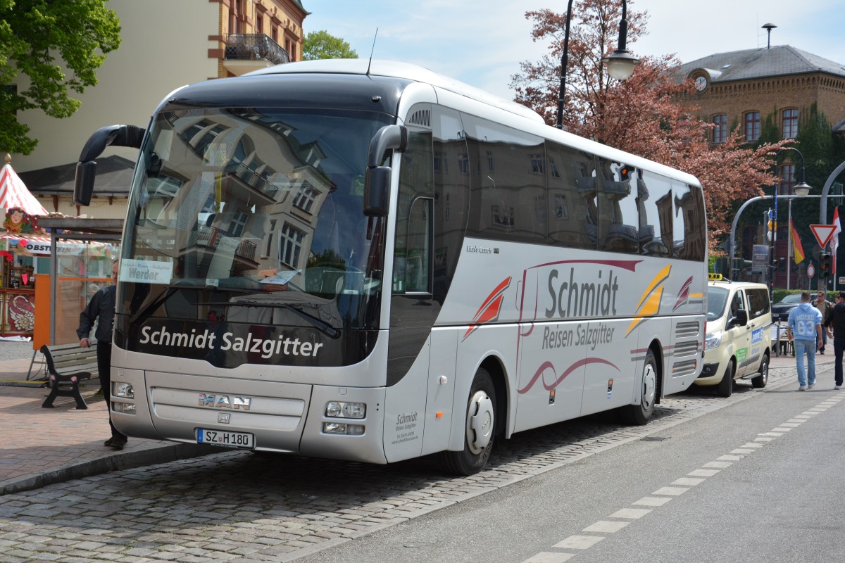 Am 03.05.2015 steht SZ-H 180 an der Bushaltestelle Werder Havel Post. Aufgenommen wurde ein MAN Lion's Coach.