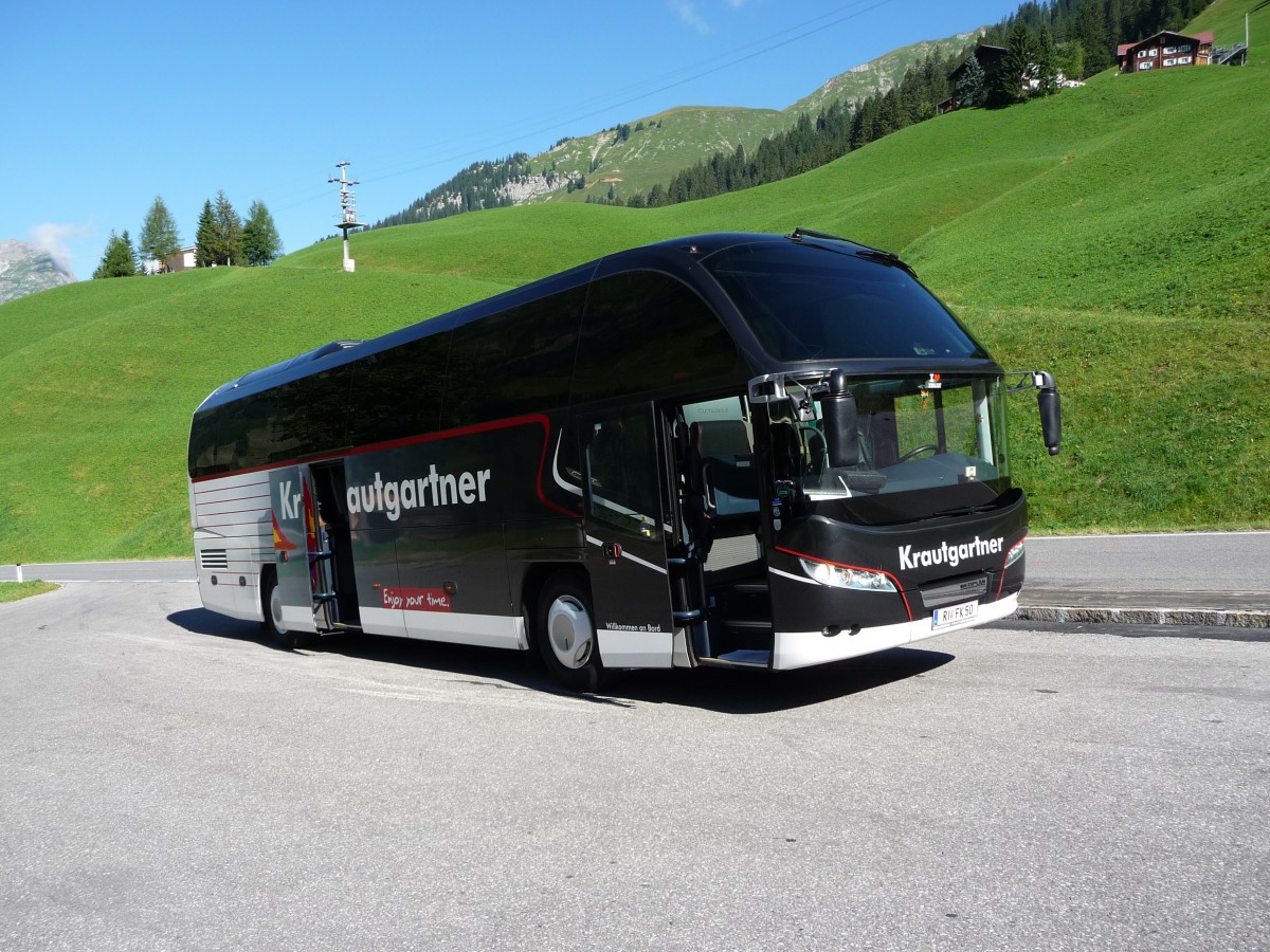 Reisebus der Fa. Krautgartner, Lohnsburg, Oberösterreich auf der Arlberg-Passstraße am 12.8.2013.