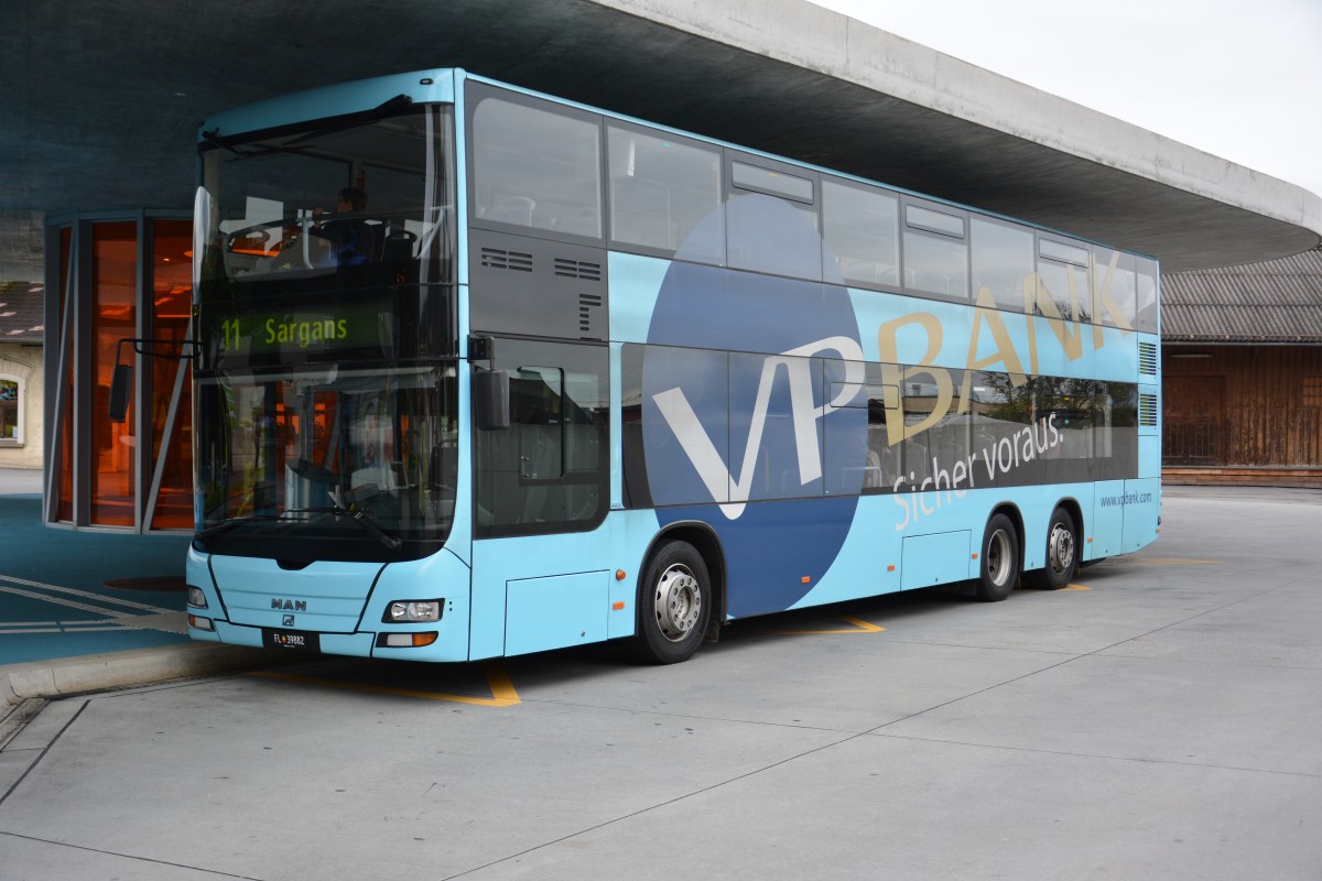 Am 08.10.2015 fährt FL-39884 (MAN Lion's City DD) auf der Linie 11. Aufgenommen am Busbahnhof Schaan, Liechtenstein.