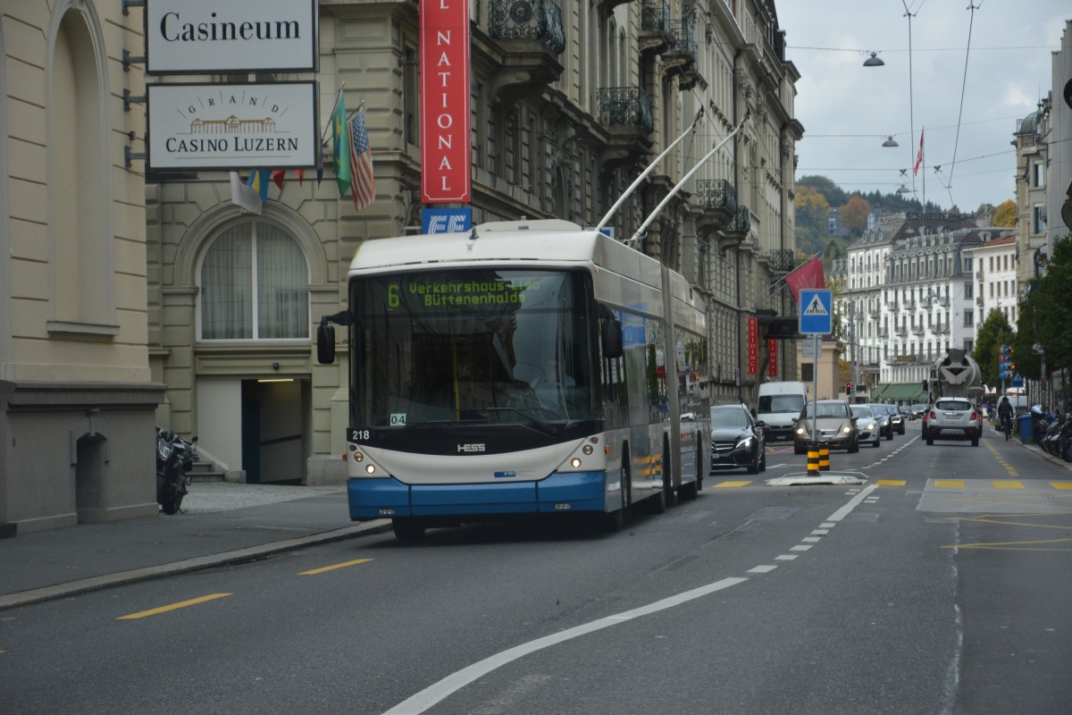Am 08.10.2015 fährt dieser Hess Trolleybus (Nummer 218) auf der Linie 6 durch Luzern. Aufgenommen an der Haldenstrasse in Luzern.