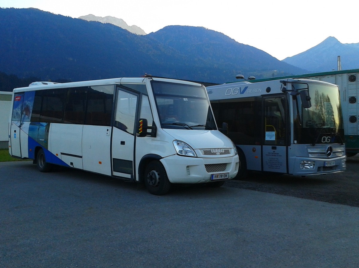 Hier noch einmal die beiden Busse, der Mercedes – Kutsenits Hydra und ein Iveco-Kleinbusder am 31.10.2015 geparkt bei der Tankstelle in Greifenburg.